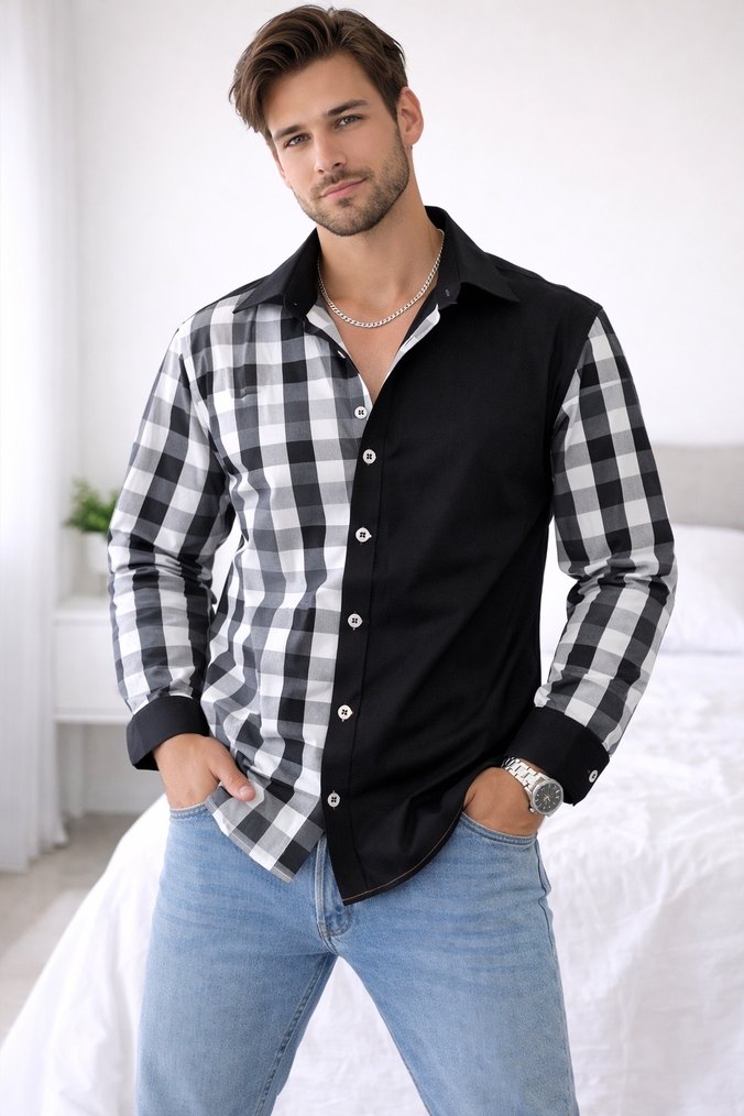 Gri Kareli ve Düz Denim Erkek Gömlek