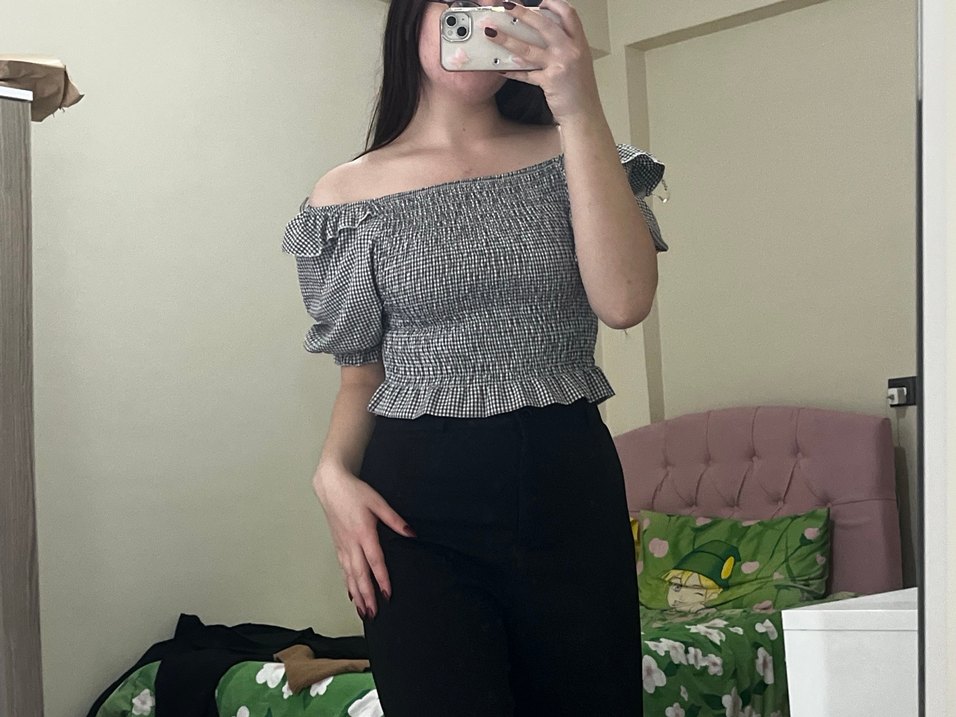 Kadınlar için gri kareli, straplez, kısa kollu ve volan detaylı dar kesim bluz. Günlük kullanım için uygun, sentetik kumaştan üretilmiştir.
