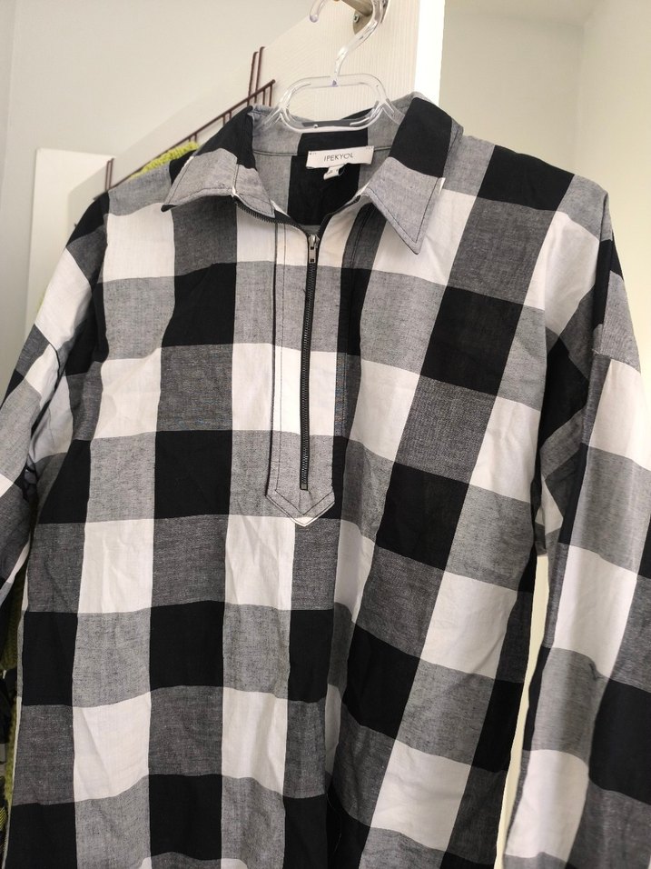 Pamuk kumaştan, uzun kollu ve yakalı gri kareli kadın gömlek. Yarım fermuarlı ve bol kesim, günlük rahat sokak stili için uygundur. iqpekyol 38 beden