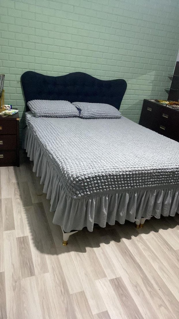 Gri kareli desenli, dokulu kumaş ve fırfırlı etekli yumuşak ve rahat yatak örtüsü.