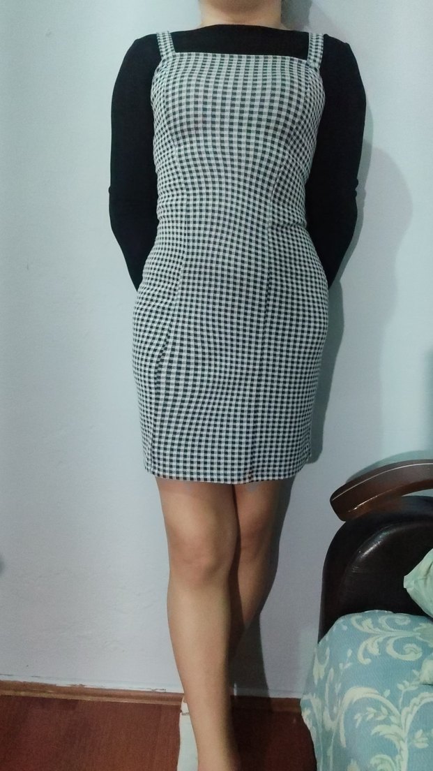 Yüksek yakalı ve uzun kollu, gri kareli desenli, yumuşak sentetik kumaştan yapılmış, vücuda oturan midi elbise. Normcore tarzında, günlük kullanıma uygun, zahmetsiz şıklık sunar.