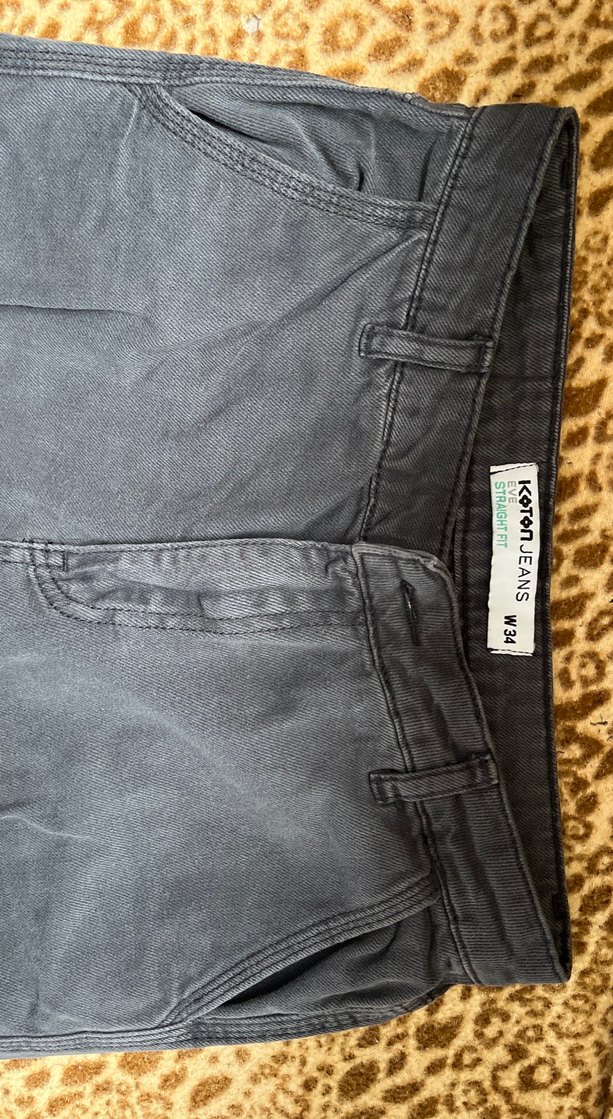 Gri renk, bol kesim ve kürk detaylı kot pantolon. Midi boyda, gündelik kullanım için rahat ve sokak tarzı uyumlu.