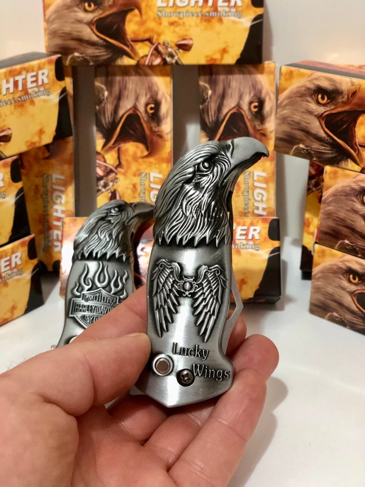 Gri renkte, kartal başı ve "Lucky Wings" yazılı detaylı metal çakı çakmak. Grunge punk tarzını yansıtan sağlam bir tasarıma sahip.