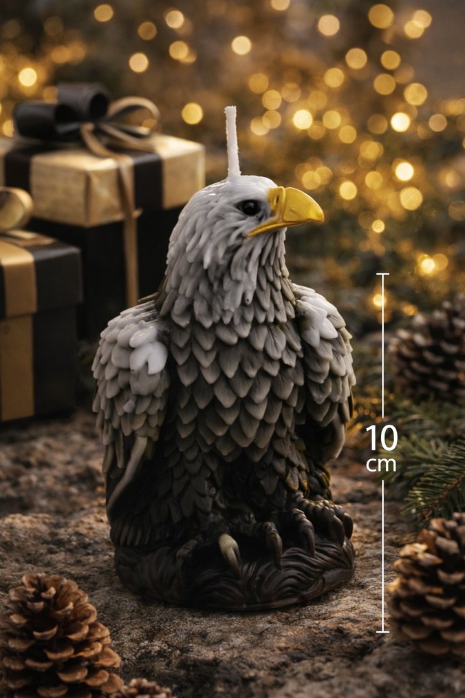 10 cm yüksekliğinde, detaylı tüy dokusuna ve sarı gagaya sahip gri kartal figürlü mum. Dekorasyona doğal bir hava katar.
