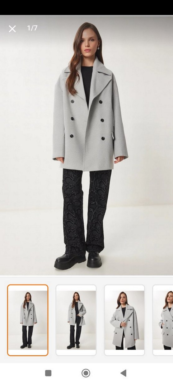 Geniş yakalı, çift düğmeli ve cepli gri kaban. Yumuşak dokulu klasik ve yapılı bir görünüme sahiptir. bedeni 38 ama geniş xl gibi.