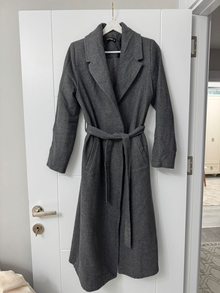 Gri renk, uzun kuşaklı kaban, yaka detaylı ve yan ceplidir. Soğuk havalar için uygundur.