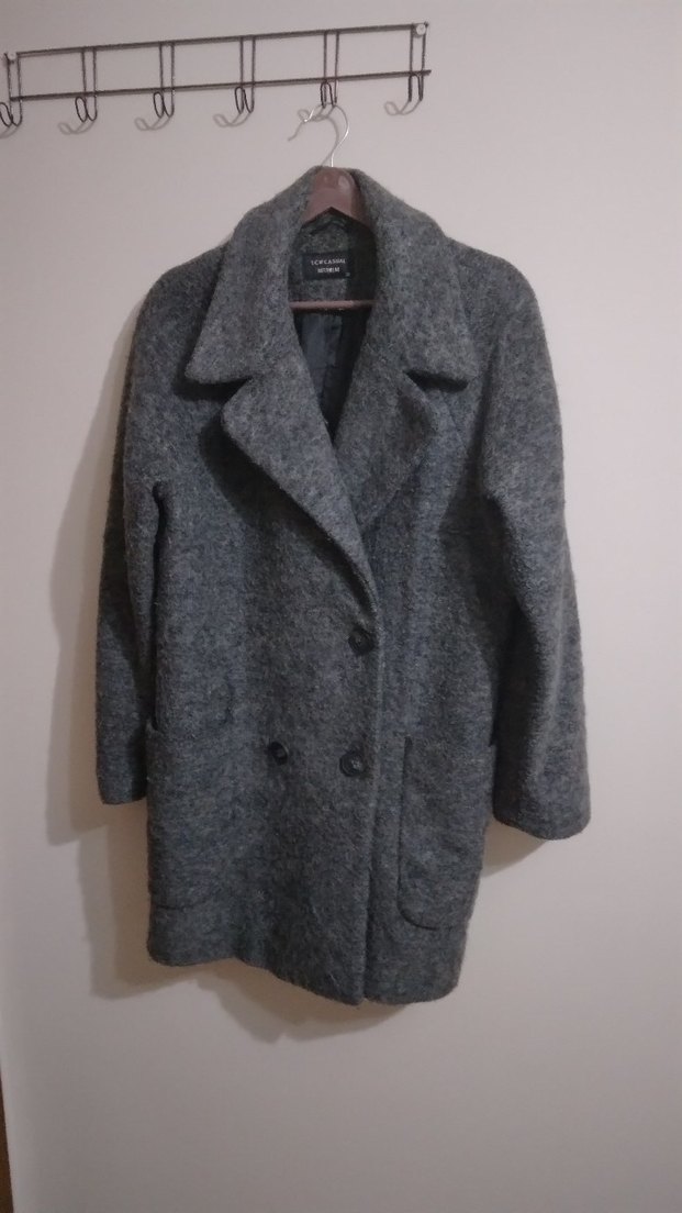 Bu gri kaban, yumuşak yün karışımlı kumaştan yapılmıştır. Çift düğmeli ön kısmı ve yan cepleri vardır. Soğuk havalar için sıcak tutar.