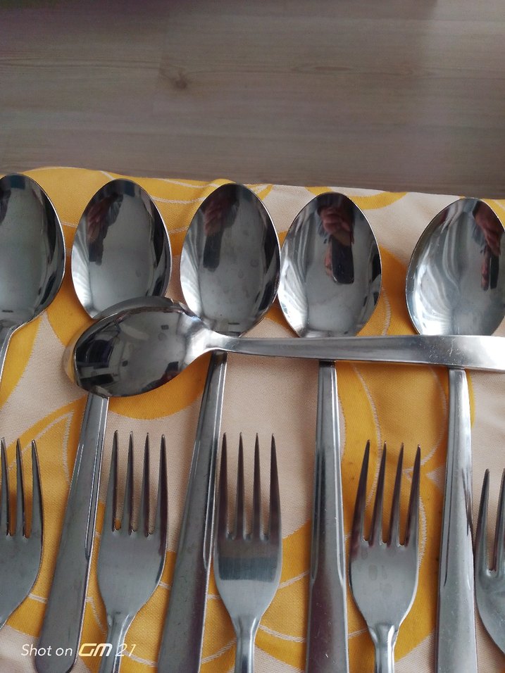Gri metal kaşık ve çatallardan oluşan set, üzerinde 'inoksan marka 6 adet kaşık ,6 adet çatal 180 TL tanesi 15 liraya gelir elimizde adetli mevcut
