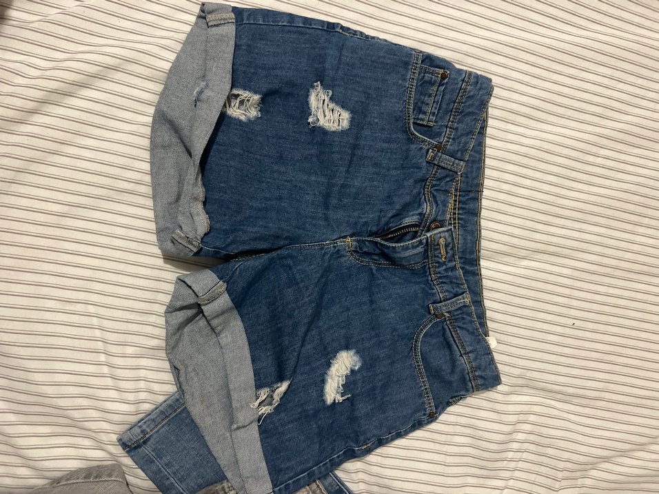 Mavi denim şortlar, gevşek kesim, tokalı detay ve yıpranmış alanlara sahip, gri katlamalı paçalarla tamamlanmıştır. Günlük sokak stili için uygundur.
