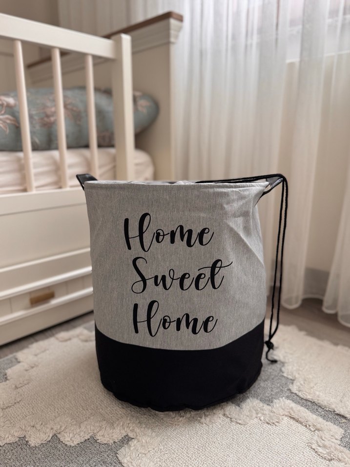 Üzerinde "Home Sweet Home" yazısı bulunan, ipli kapaması olan gri katlanabilir saklama sepeti. Eşyalar için kullanışlıdır.