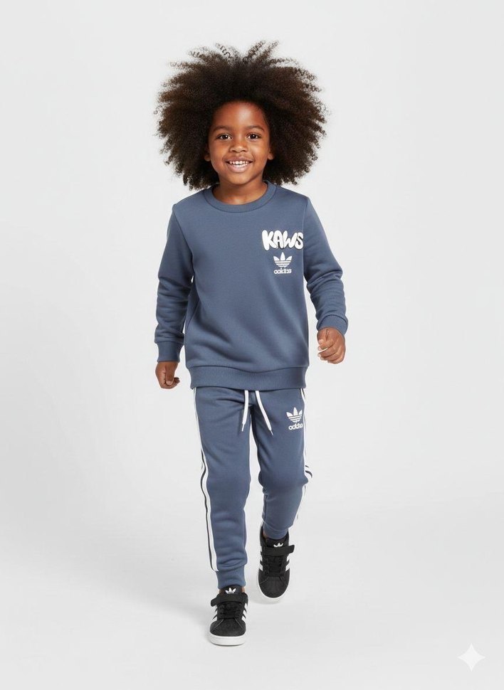 Gri renkli, bol kesim erkek çocuk eşofman takımı, yuvarlak yaka sweatshirt ve pantolondan oluşur. Yumuşak kumaş, KAWS baskı ve cırt cırt detayları içerir.
