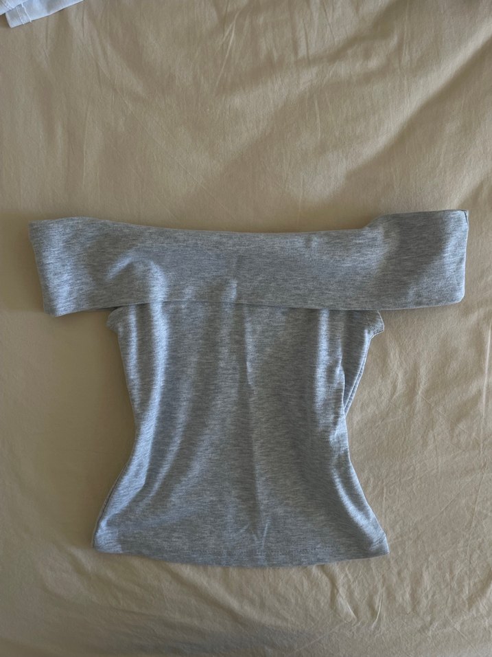 Kayık yaka ve kısa kollu, düz gri renkte, rahat sentetik kumaştan yapılmış dar kesim bluz. Crop değildir.