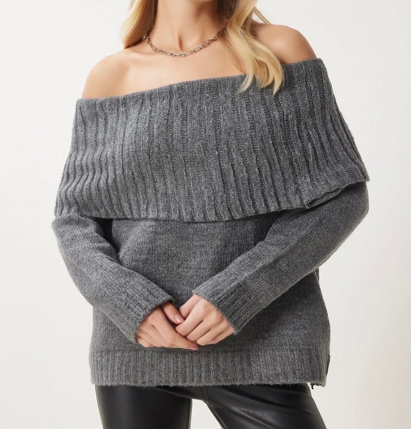 Gri renkli, kayık yaka ve uzun kollu örgü kadın kazak. Rahat ve bol kesim, günlük kullanıma uygundur.