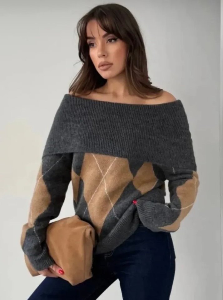 Kayık yaka, uzun kollu ve bol kesim gri örgü kadın kazak. Kısa boyu ve rahat dokusu günlük kullanıma uygundur.