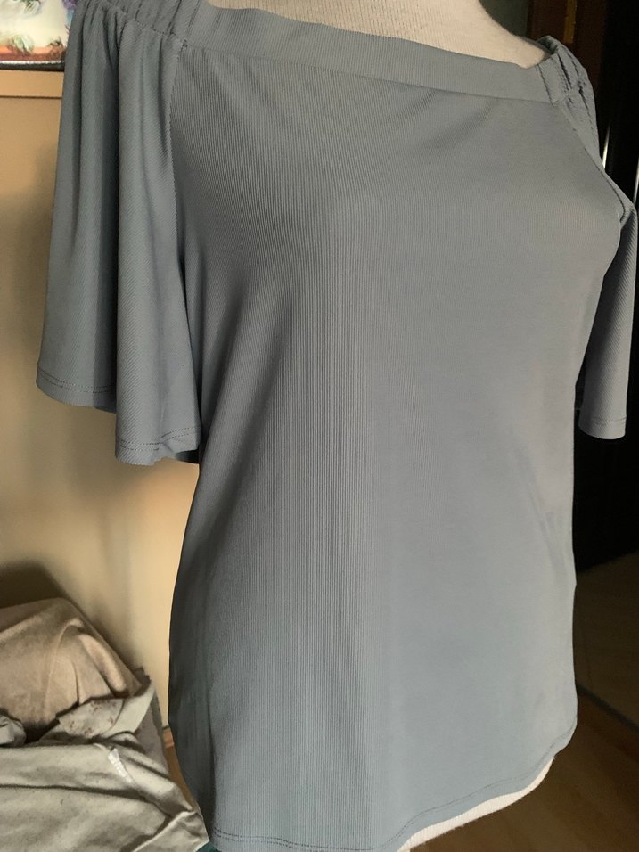 Gri renkte, kayık yaka ve kısa, dökümlü kolları olan bol kesim tişört temiz sorunsuz bir ürün
