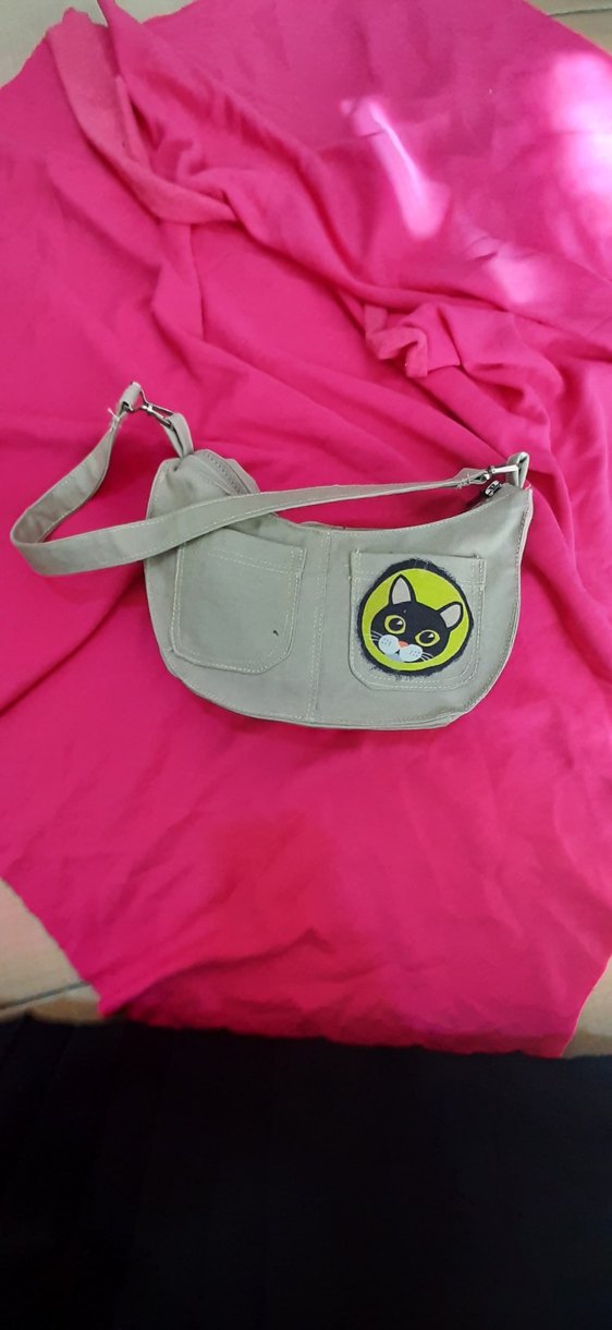 Sentetik kumaştan, kayışlı ve baskılı kedi desenli gri kadın çantası. Sokak stiline uygun bir tasarım.