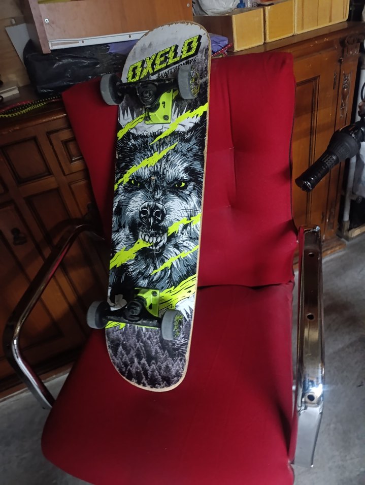 Kara ve gri renklerde, kurt desenli kaykay. Sarı şimşek detayları ve siyah aparatları ile çocuklar için uygun.
