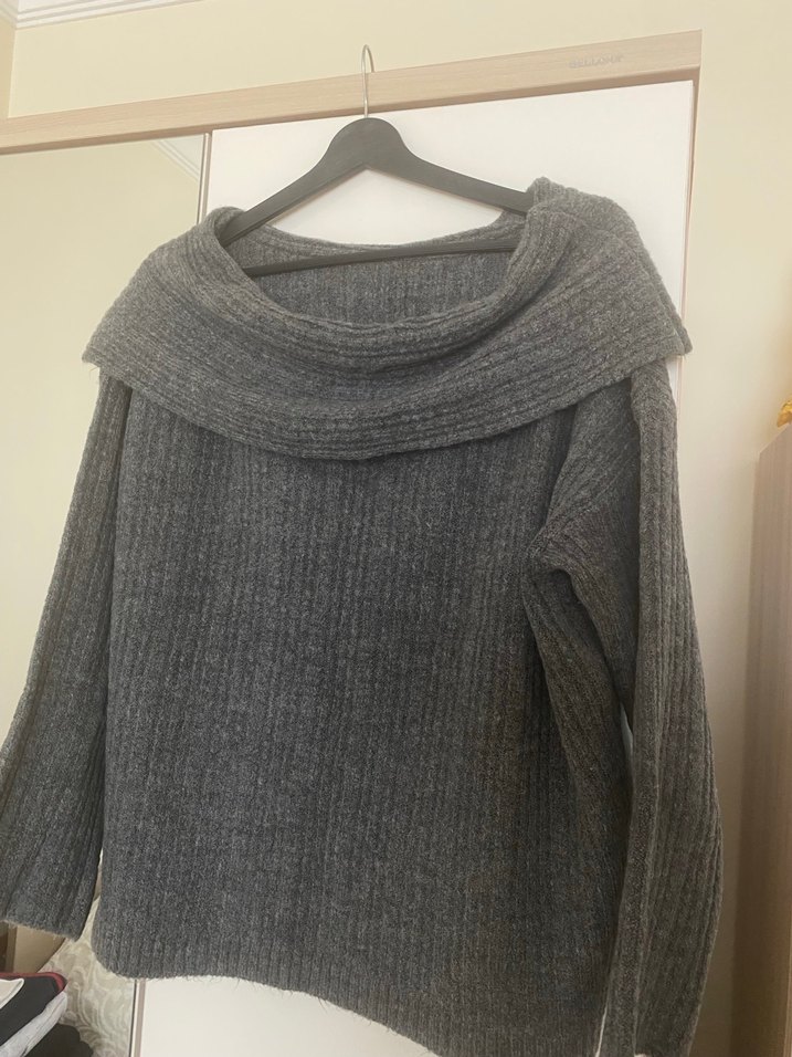 Gri renk, örgü kumaştan yapılmış, kayık yaka ve uzun kollu, oversize kesim kadın triko kazak. Normal midi boyda ve desensiz, günlük kullanım için uygun. Kayık yaka standart beden hiçbir deforme vs yoktur