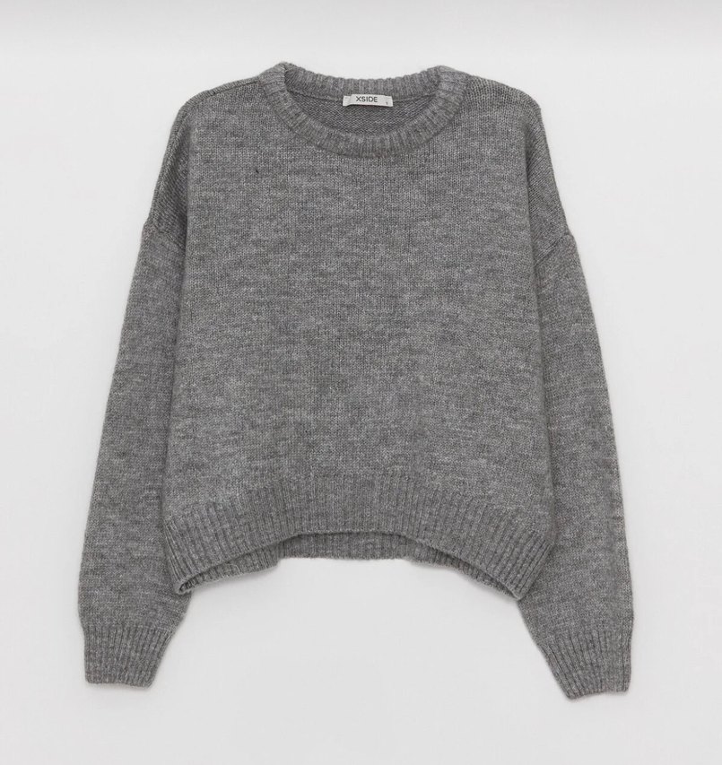 Gri renkli, örme yün kumaştan yapılmış, yuvarlak yakalı ve uzun kollu bu kazak, rahat ve bol kesimdir. Düz deseniyle günlük kullanıma uygundur.