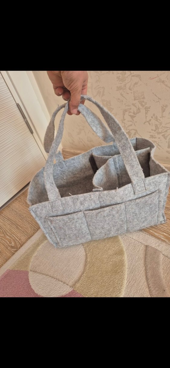 Çok bölmeli ve sağlam saplara sahip gri keçe bebek çantası, eşyalarınızı düzenlemek için uygundur.