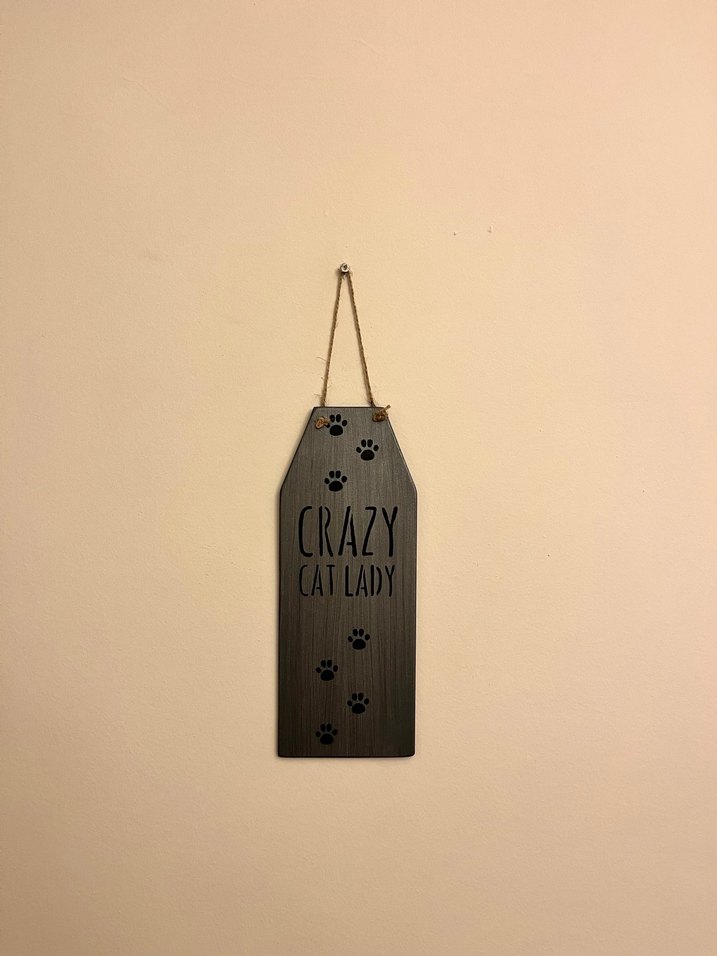 Gri renkte, pati izleri ve "Crazy Cat Lady" yazılı duvar aksesuarı, kedi severler için uygun.