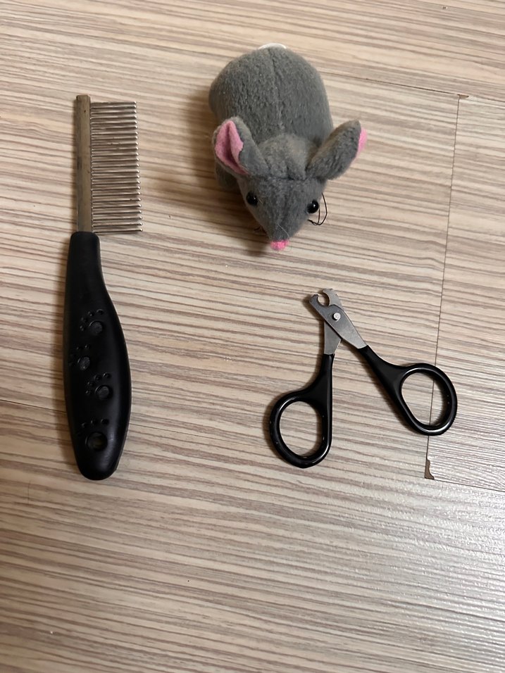 Gri renkte kedi bakım seti; tarak, tırnak makası ve fare şeklinde oyuncak içerir. Bakım ve oyun için gerekli ürünler.fare çalışıyor