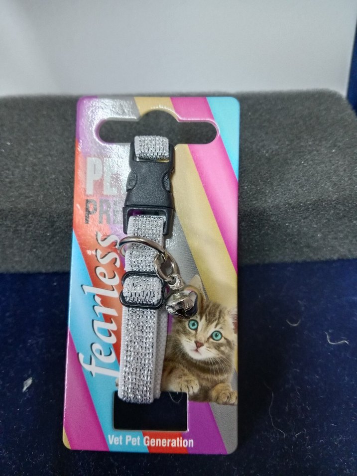 Ayarlanabilir tokalı, küçük çanlı gri kedi boyun tasması. Vet Pet Generation markalı, konforlu ve şık tasarım.