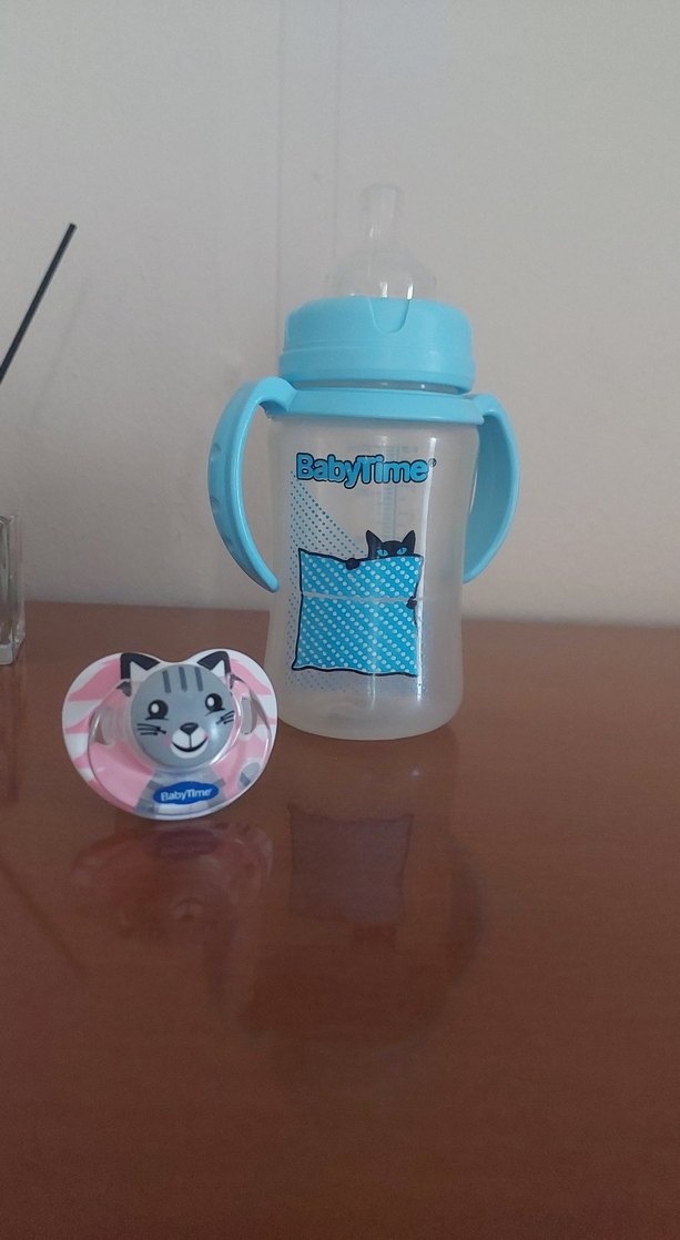Gri renkte, kedi yüzü desenli ve BabyTime markalı bebek emziği.emzik sifir biberon kulanilmiş