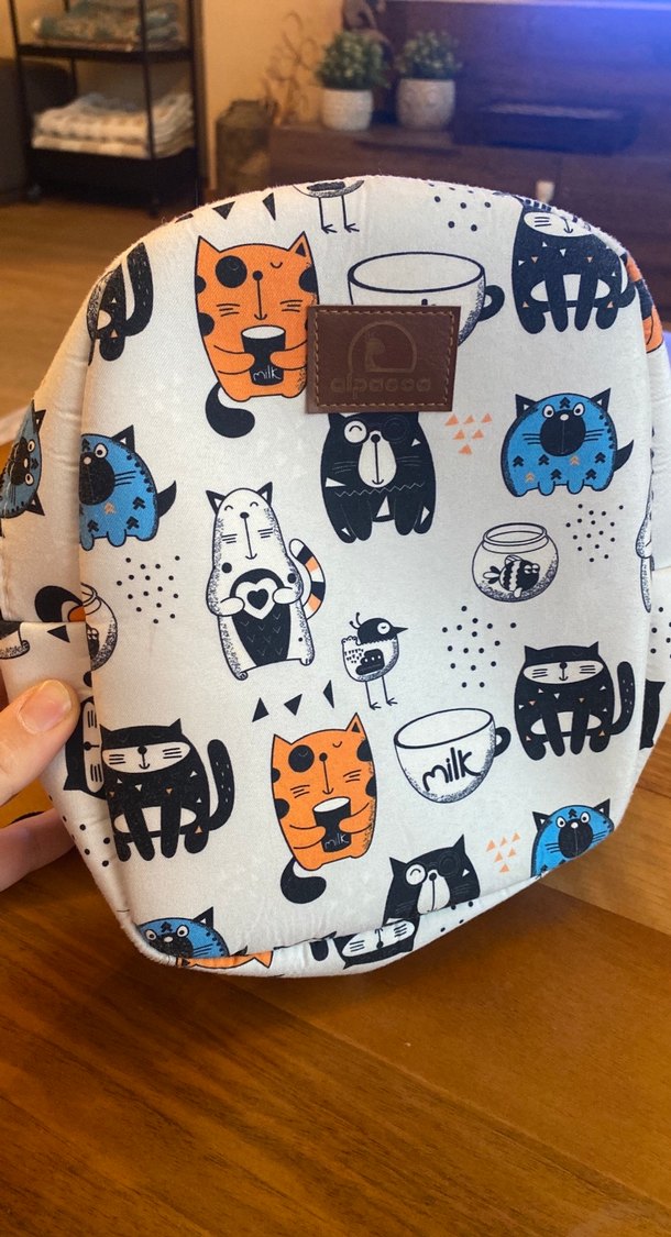 Gri renkte, çeşitli renklerde kedi desenleri bulunan yumuşak dokulu kedi aksesuar çantasıdır.