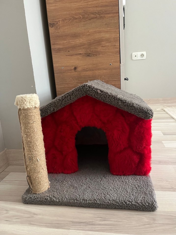 Gri kedi evi, yumuşak kırmızı iç kısmı ve bej tırmalama direği ile konforlu ve işlevsel bir alan sunar. Nerdeyse hiç kullanılmadı kedimizi vermek zorunda kaldığımız için.