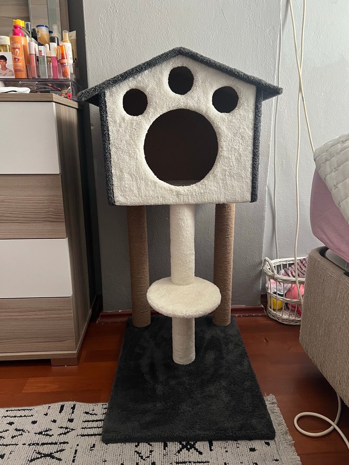 Gri kedi evi, çoklu delikler ve tırmalama direkleri ile kediler için rahat ve eğlenceli bir alan sunar.