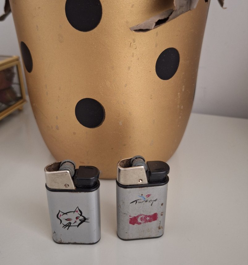 Kedi figürlü ve Türkiye bayrağı desenli gri çakmak seti, kompakt ve taşınabilir yapıda.koleksiyonluk iki adet fiyatıdır