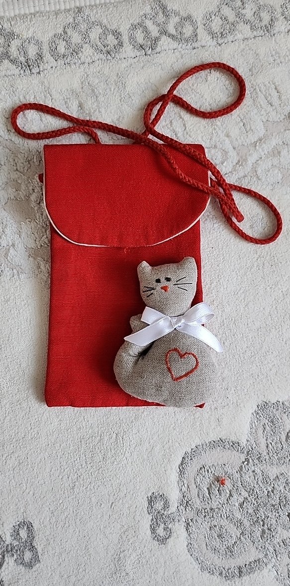 Küçük kırmızı telefon çantasi , beyaz kurdeleli ve kalp işlemeli gri kedi figürü ile süslenmiştir. kedi severler için cok tatlı bir ürün