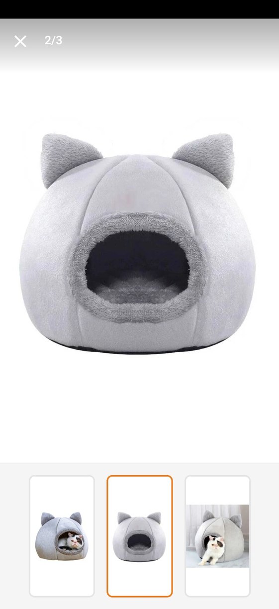 Peluş kulaklı, içi yumuşak gri kedi kulübesi, kediler için rahat bir dinlenme alanı sağlar.