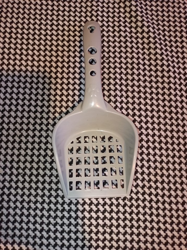 gri kedi kumu küreği, delikli sapı ve geniş delikli yapısıyla kolay temizlik sağlar.