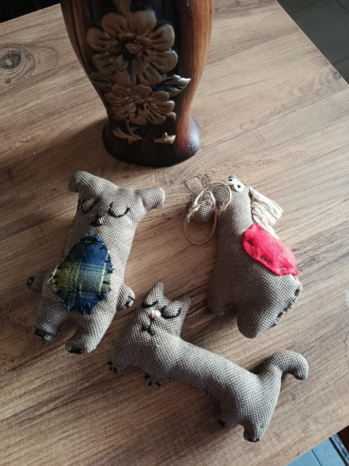 Kediler için üçlü gri oyuncak seti, farklı şekil ve kumaş parçalarıyla dikkat çekiyor.