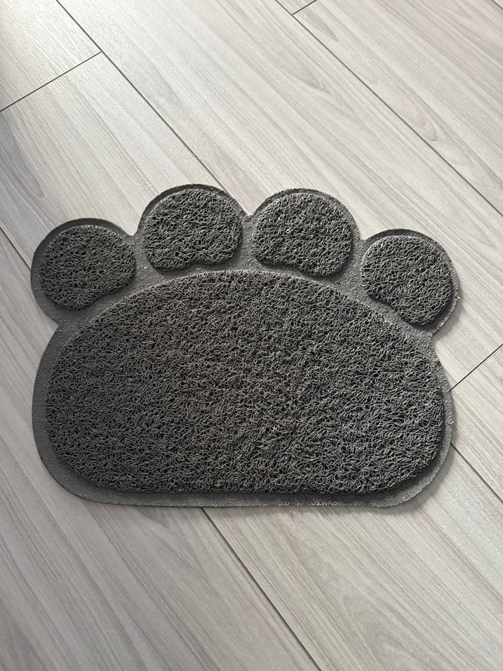 Zeminleri temiz tutmaya yardımcı gri kedi pençe şeklinde dokulu paspas. Ölçüleri: 30-36 cm