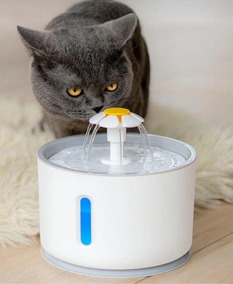 Gri renkte, çiçek şeklinde su püskürten kedi su pınarıdır. Şeffaf su seviyesi göstergesi bulunur.