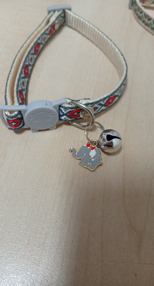 Desenli gri kedi tasması, fil figürlü küçük bir süs ve ses çıkaran zil içerir. Plastik kedi yüzü desenli toka ile güvenlidir.