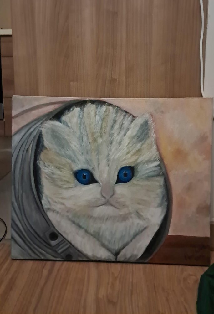Mavi gözlü gri kedinin yer aldığı, sıcak ve sanatsal bir atmosfer sunan dekoratif tablo.