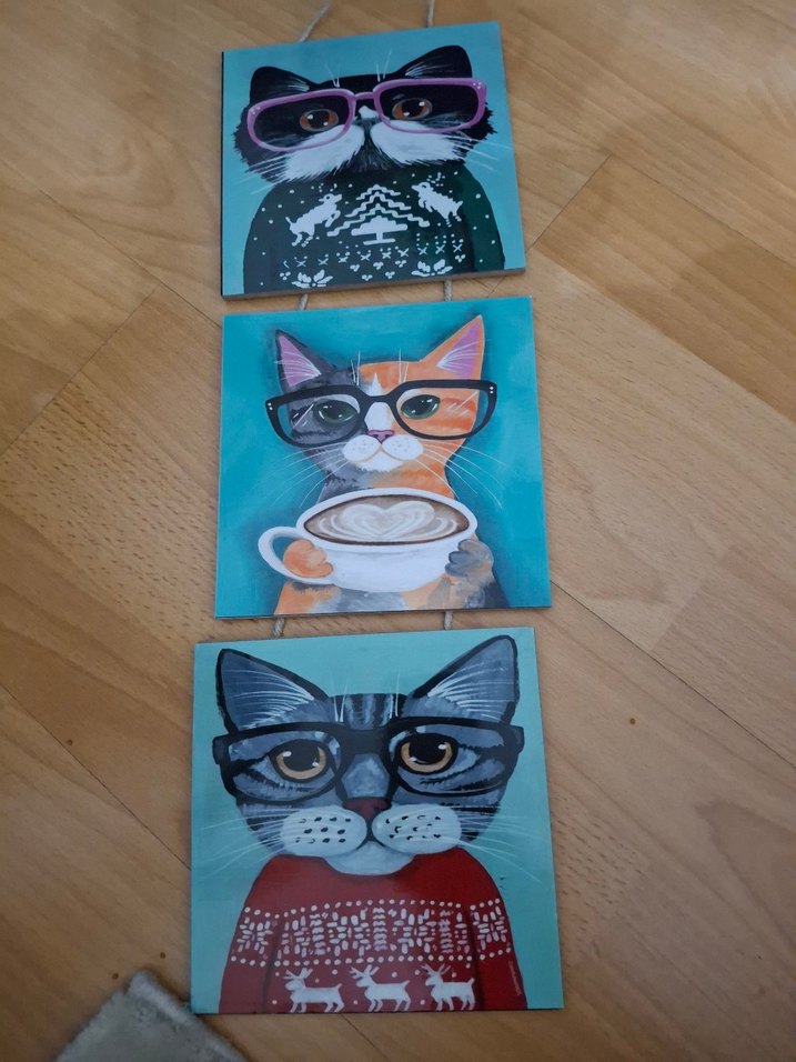 Gözlük takan gri kedilerin farklı tasarımlarıyla üçlü duvar dekoru seti. Kedi severler için uygun .