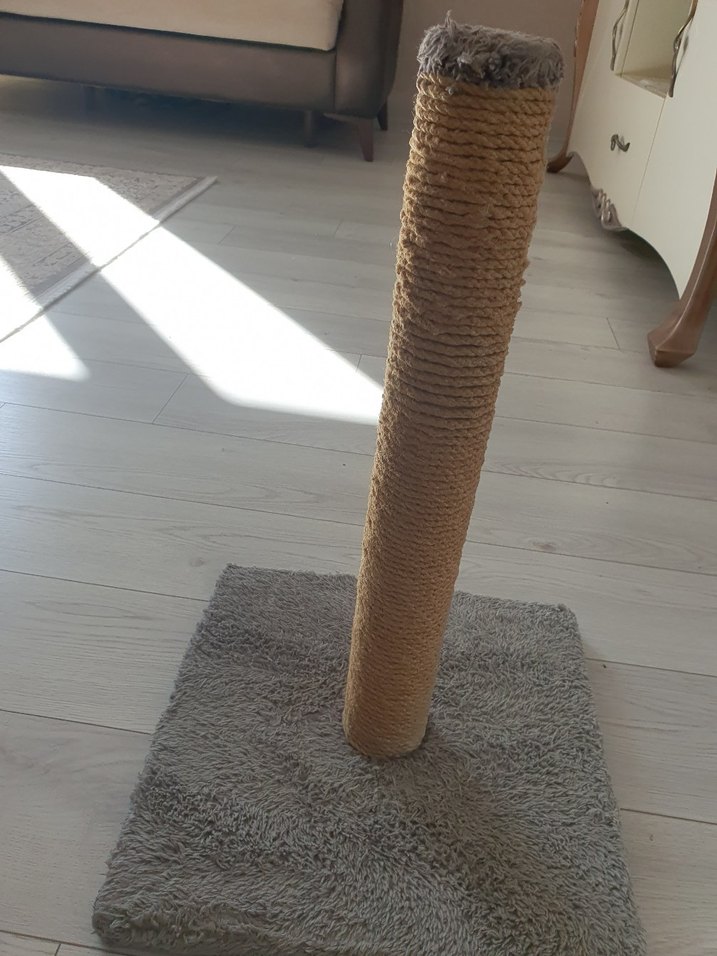 Gri taban ve uzun sisal kaplı direği olan kedi tırmalama direği .