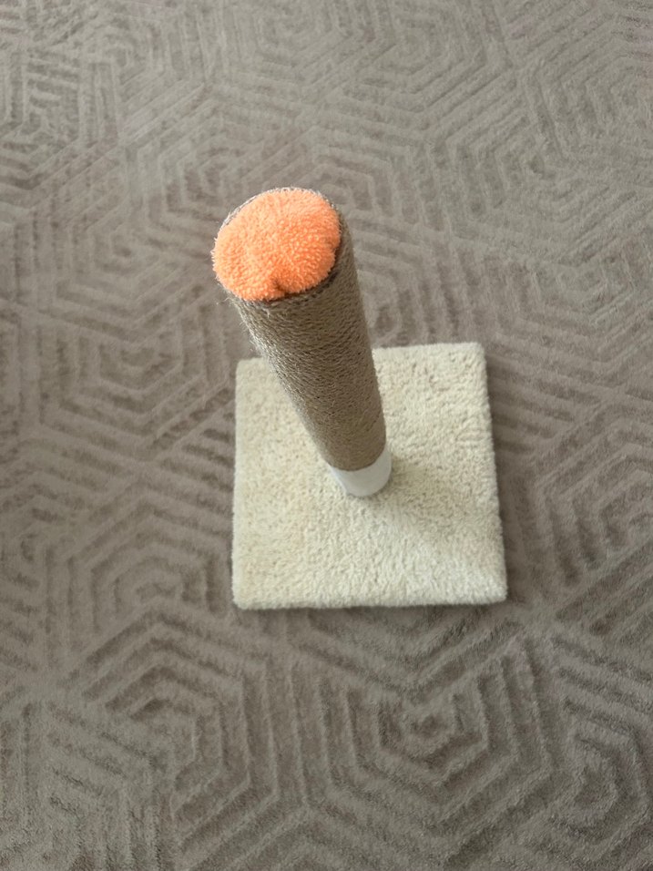 Turuncu uçlu ve kare tabanlı gri kedi tırmalama direği, kedilerin eğlenmesi ve tırnak sağlığı için uygundur. Sadece 2 gün kullanıldı.