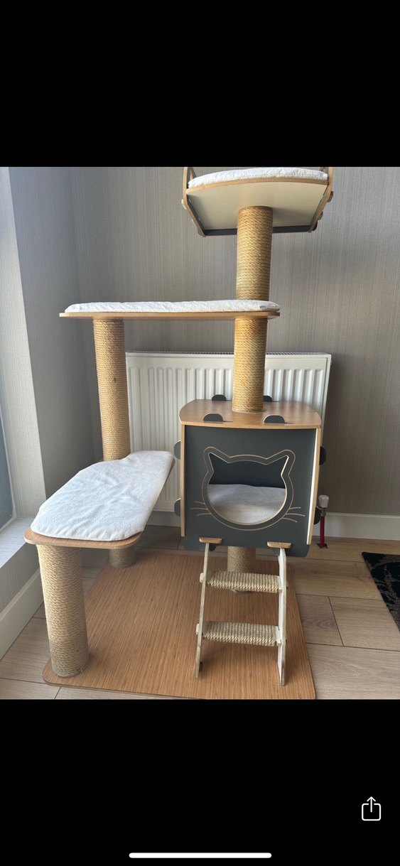 Gri renkte, yumuşak minderli, çok katmanlı kedi tırmalama ve oyun evi, tırmanma ve dinlenme alanları sunar.