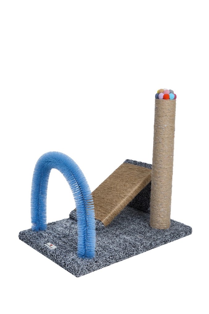 Gri renkte, doğal iplerle kaplı tırmalama direği, eğimli rampa ve mavi oyun kemeri içeren kedi aksesuarı. Üstte renkli toplar vardır.