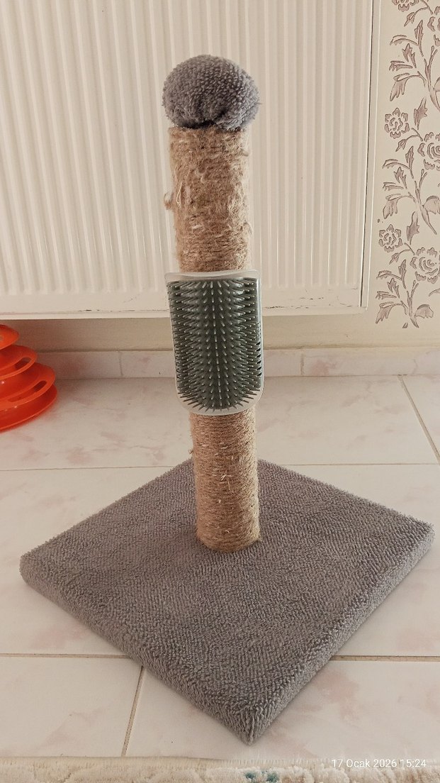 Gri renkte, doğal lif kaplı tırmalama direği ve tüy temizleme fırçası içeren, yumuşak tabanlı kedi aksesuarı.