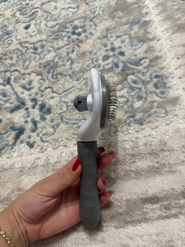 Gri renkte, konforlu tutma sapına ve ince metal kıllara sahip kedi tüy tarama fırçası.