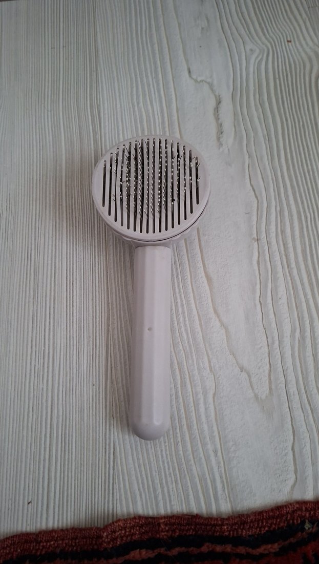 Gri renkte, metal ince dişlere sahip kedi tüyü fırçası, tüyleri toplar ve tüy bakımını kolaylaştırır. Rahat tutma sapı bulunur.