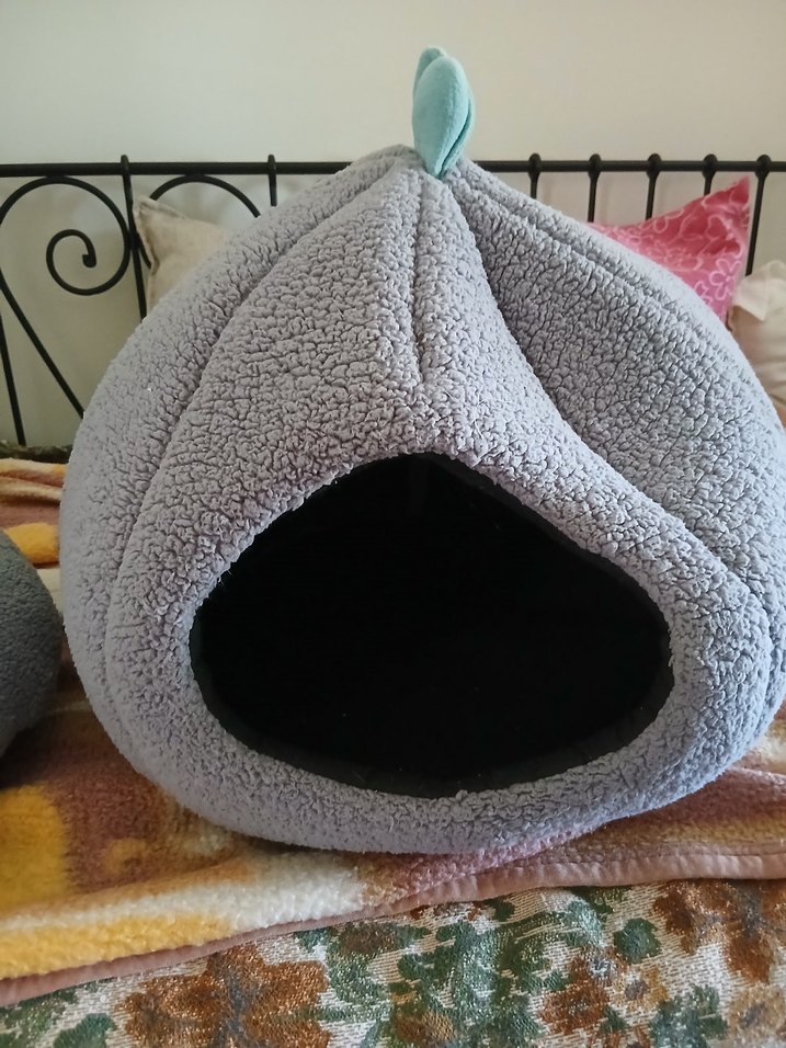 Yumuşak ve sıcak kumaştan gri kedi yatağı, kediler için kapalı ve rahat bir tasarıma sahiptir. Üstünde küçük yaprak detayı bulunur.