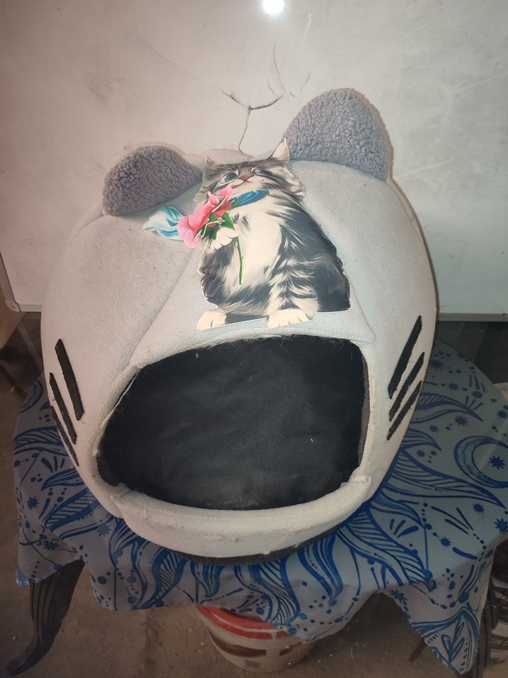 Yumuşak kulakları ve çiçekli kedi baskısı olan gri kedi yatağı, evcil hayvanınız için rahat bir dinlenme alanı sunar .